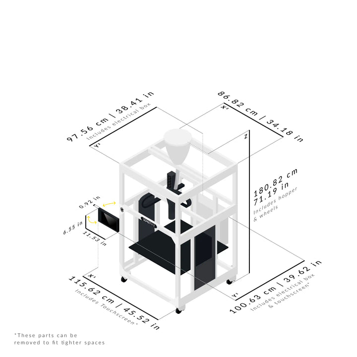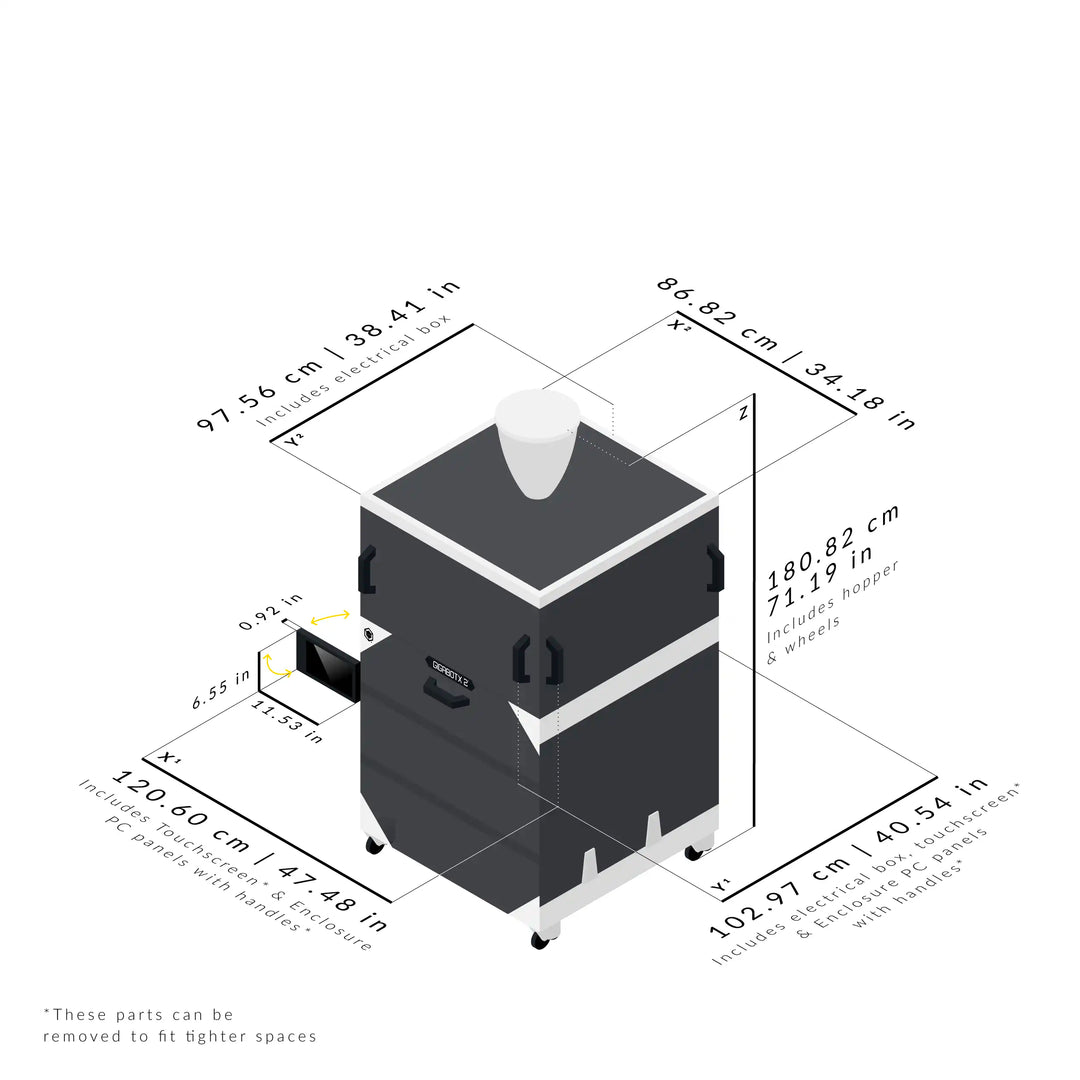 Dimensions measured with full enclosure PC panels with handles, pellet / flake hopper, touchscreen, electrical box & wheels.